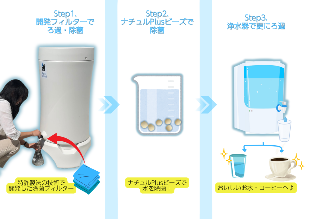 今回、私たちがブースで行った最大のチャレンジ。それは「雨水から作ったコーヒー」の試飲です。